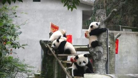 2020年1月21日,大熊猫双胞胎幼仔“双双”“重重”和“喜喜”“庆庆”用小竹篓背着“年货”,给已经37岁的“曾祖母”大熊猫“新星”拜年。