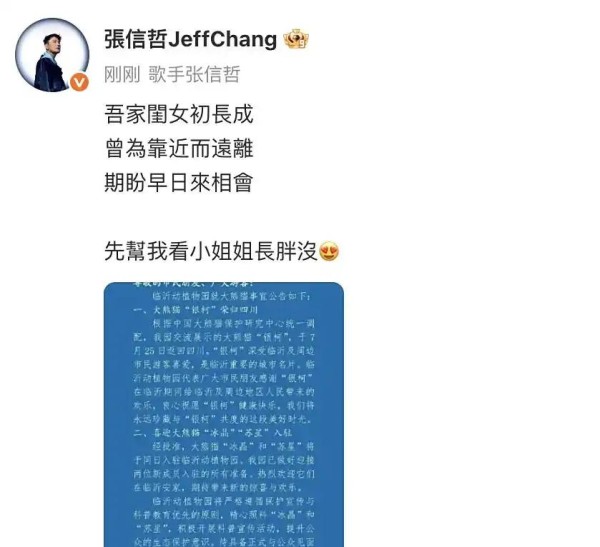 今年7月,“冰晶”与同伴“苏星”接替返回四川的大熊猫“银柯”入驻临沂动植物园,张信哲特意发社交动态牵挂:“吾家有女初长成,期盼早日来相会”,还带话题追问网友“帮我看看闺女长胖没”,亲昵模样被粉丝调侃“是操心的熊猫奶爸”。此次虽因海外工作无法到场,他提前一周就协调团队录制祝福视频,反复确认细节才满意。