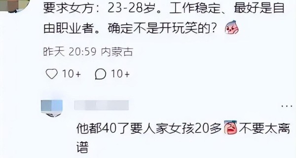 更狠的是他自己提的要求:女方要23到28岁,身高165以上,还得有稳定工作。