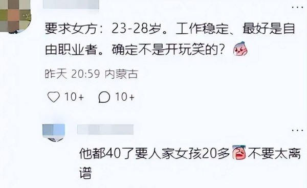 令人感到又好气又好笑的是,他挑选伴侣的条件可不低,要求对方年龄在23至28岁,身高165以上,且有稳定工作。网友们看到后,瞬间炸开了锅,质疑道:你不过是个刚有起色的中专学历中年男子,凭什么提出如此高的要求?
