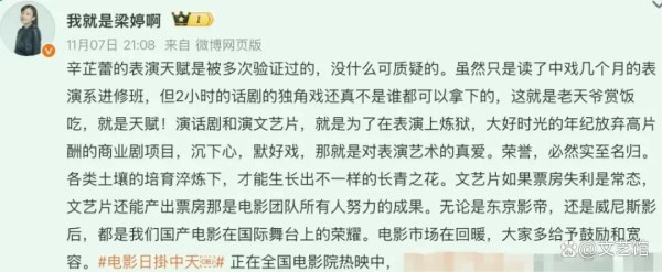 她说,辛芷蕾的表演天赋是被多次验证过的,她是老天爷赏饭吃,是天赋,能在最好的年纪放弃高片酬的商业剧项目,是对表演艺术的真爱。
