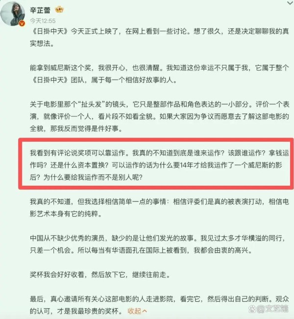 “我真的不知道到底是谁来运作?该跟谁运作?拿钱运作吗?还是什么资本置换?可以运作的话为什么要14年才给我运作了一个威尼斯的影后?为什么要给我运作而不是别人呢?”