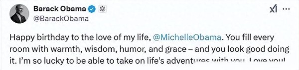 63岁的奥巴马曾写下:“祝我此生至爱米歇尔生日快乐。你让每一处空间都洋溢着温暖、智慧、幽默与优雅,做任何事都无比出色。能与你一同开启人生的奇妙旅程,我深感幸运。爱你。”