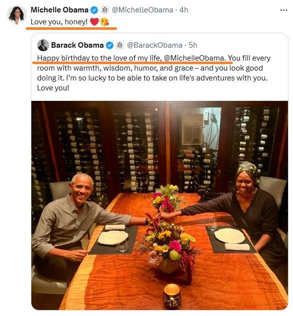 一个小时后,刚刚迎来61岁生日的前第一夫人也做出了甜蜜的回应,“爱你,亲爱的!”