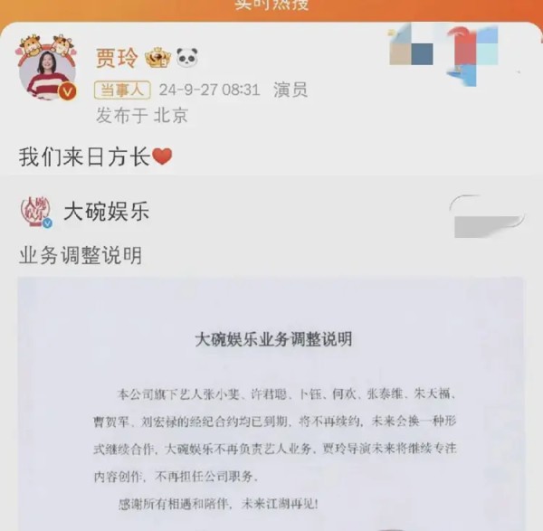 热搜!大碗娱乐发文:贾玲不再担任公司职务,张小斐等艺人不再续约!贾玲、许君聪等纷纷转发:“我们来日方长”
