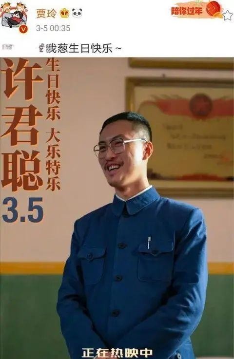 3月5日零点刚过,贾玲在社交媒体上为许君聪送上了生日祝福,亲切地称他为“我葱”,并附上了一张许君聪在电影《你好,李焕英》中的剧照,其中他饰演了主任一角。