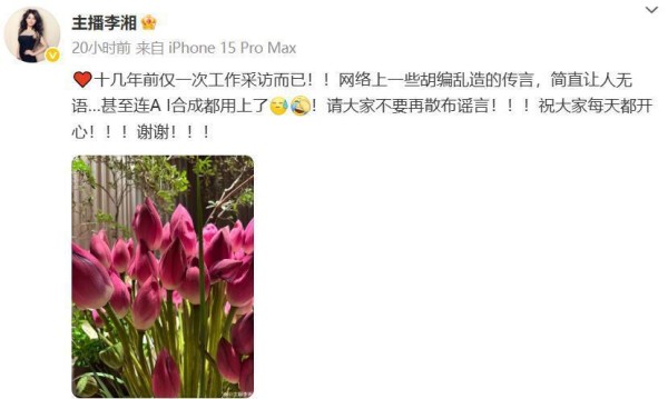 昨天,李湘在自己的社交平台上公开表态,强调那次两人之间的接触只是一次工作采访而已,根本不存在什么亲密关系。
