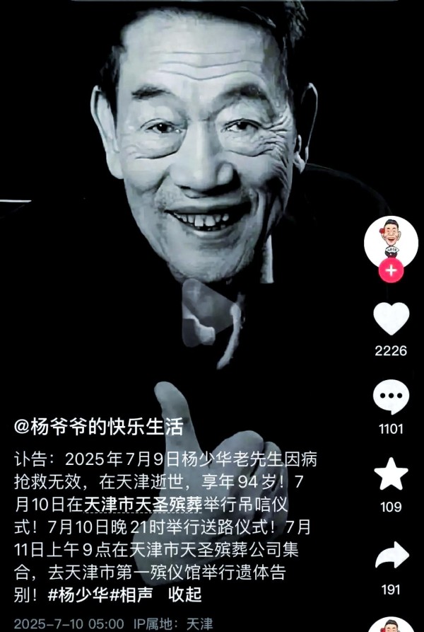 7月9日,享年94岁的相声表演艺术家杨少华离世,他的离去如同一部跌宕起伏的电视剧,引发了广泛关注。在杨少华去世当天上午,他还在儿子的陪伴下,顶着烈日坐在轮椅上参加剪彩活动,这一幕幕仿佛就在眼前。