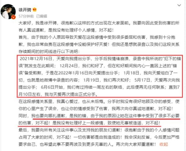 渣男终于还是低头认错了,公开道歉说自己犯错时间是去年12月,两人今年1月提出分手,后来复合、分手、复合,最终在7月10日正式分手。网友们看完他的道歉,都觉得他说的“屁话连篇”,不过还是得承认渣男这次真的很“努力”地解释自己的行为。