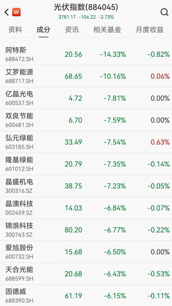 光伏板块大跳水。阿特斯跌超14%,多股跌超7%。