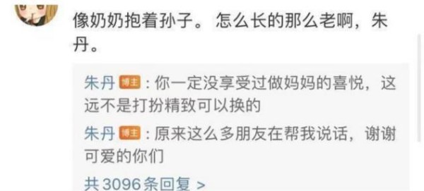 而且如果有网友说他老公不好之类的,她会为自己的丈夫说话,印象最深的是有次她老公和助理同喝一杯奶茶,遭到了很多网友的谴责,但朱丹却觉得这没什么,当事人都不觉得有问题,我们作为旁人也适可而止吧。