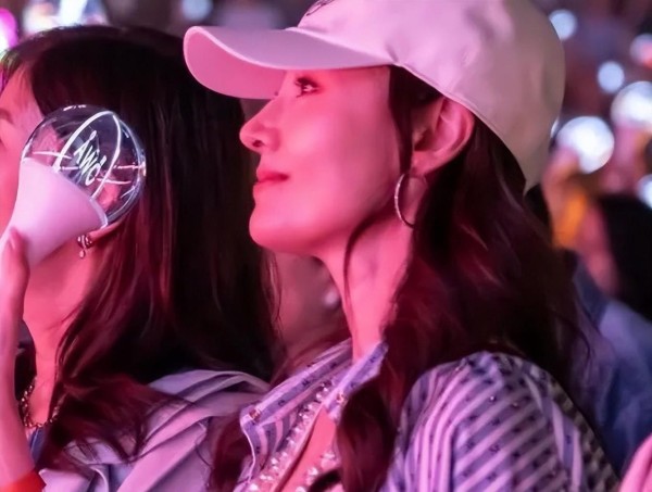 和之相比,55岁的李嘉欣完全融入到演唱会的氛围里,从穿搭到神情都透着一股年轻的气息。头上戴着一顶白色棒球帽,搭配披肩卷发,耳朵上挂着一对复古的大圆圈耳环,衣着则是条纹蓝色衬衫配白色背心,脖子上还系着潮流的珍珠长项链,整个人看上去既休闲又时尚。手里拿着应援棒摇晃着,脸上的神情也相当投入,完全看不出岁数已到55的模样。