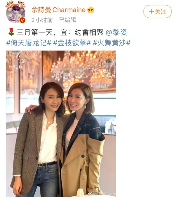 近日,香港艺人佘诗曼在某社交平台晒出和黎姿的亲密合影,并称:三月第一天,约会相聚。