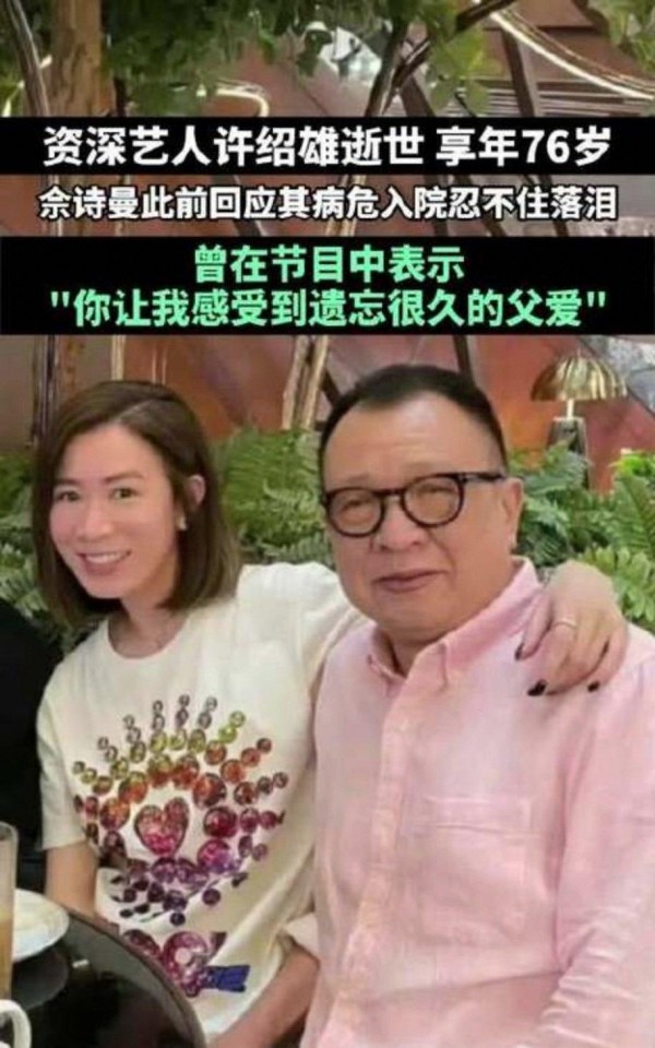 佘诗曼与许绍雄关系超越合作,私下情同父女亲如一家,佘诗曼称他老爸,如今许绍雄生老病死她失去一个爱护自己的人佘诗曼暖心承诺照顾许绍雄家人 娱乐圈真挚情谊引热议