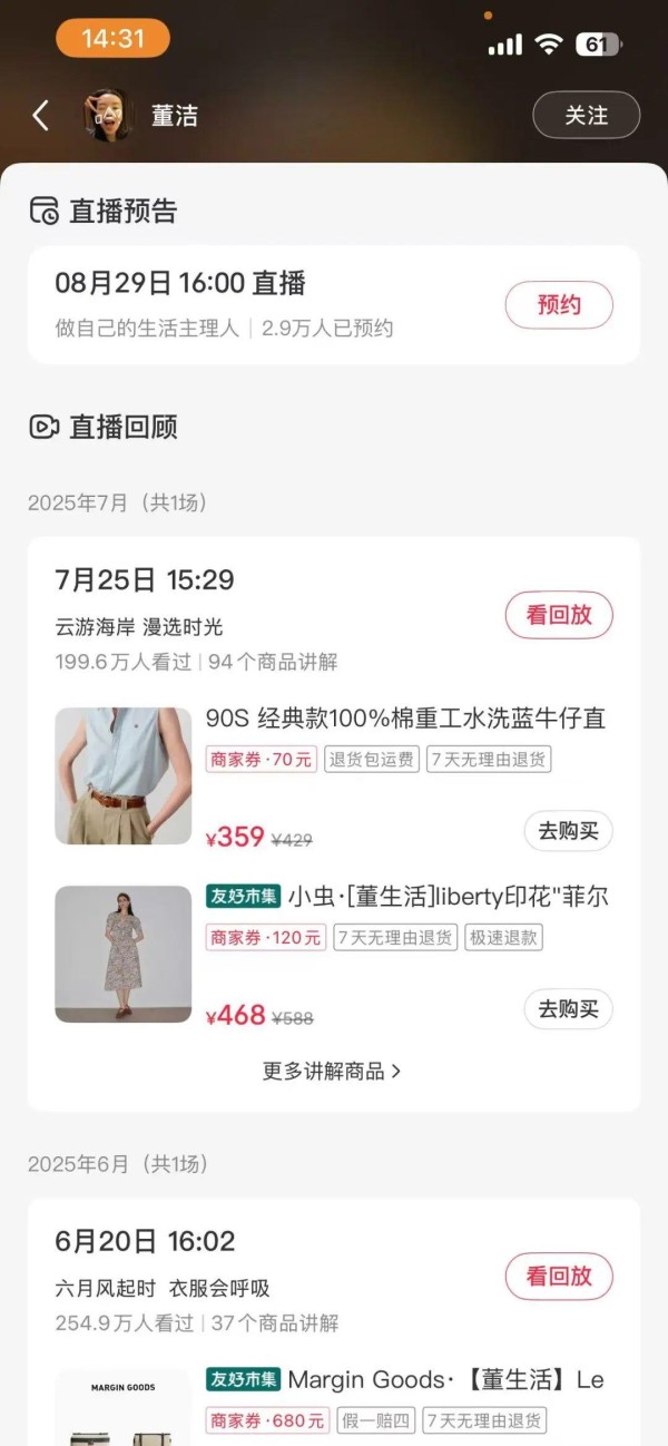 只是现在,董洁的声量大不如前,账户主页显示的直播频次降低到每月仅有一场。李诞则是被清算历史旧账,钉在了辱女的耻辱柱上。此前在小红书大火的名媛带货风代表章小蕙,也开始将重心转移到其他电商平台上。她的主页界面显示,整个 618 期间仅有一场直播,近两个月来均未在小红书开播。