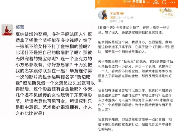 虽然在颁奖后,文晏与评委们逐一解释了网传的内幕并非事实,“女主竞争非常激烈”“奖是评委一起评出来的”……但群众似乎并不买单。随后,郝蕾朋友圈发文批判“撕奖”乱象,把东京、戛纳、威尼斯电影节奖都“批”了一遍。