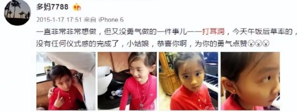 2015年,妈妈孙莉在微博晒出黄多多打耳洞的照片。