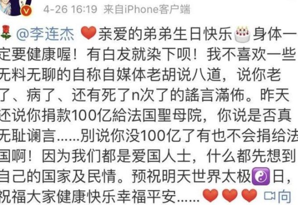 4月26日。是功夫皇帝李连杰大生日,当天,圈内送上祝福的人却很少,但是值得一提的是,刘亦菲、向佐、向太等明星倒是送上了祝福。向太所发的生日祝福不仅表达了对李连杰的关心,还替他澄清了捐赠100亿给法国修缮巴黎圣母院的绯闻,不得不说向太真的是有情有义。