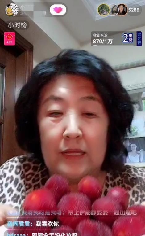 而且《婆婆妈妈》这一档节目也让很多人认识到了明星的婆婆们,比如说钟丽缇和伊能静的婆婆以及林志颖的妈妈,现在也成了网络红人。而如今钟丽缇的婆婆也开启了直播模式。并且从她所开的直播当中我们可以看出,确实是一个新手,只开了一个美颜,在自己家中就面对观众了。
