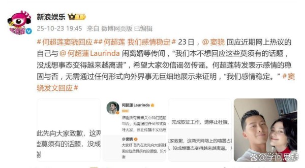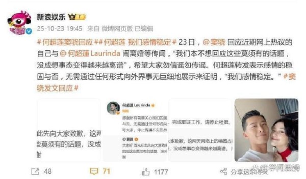 至于何超莲,她的回应就有点温婉悠长的味道。没写小作文,连磕带拌地转发了一下老公的声明,顺便丢了句“我们感情稳定”。字数虽少,但信息量很大。换句话说,她不就是在告诉大家:“感情好不好我们自己知道,不用演给你们看的。”这句话吧,既是声明,也是态度,也侧面回应了公众的好奇心和窥探心理。全程看下来,网友倒是挺买账——有人说:“比那些天天发恩爱照片的明星真实多了。”