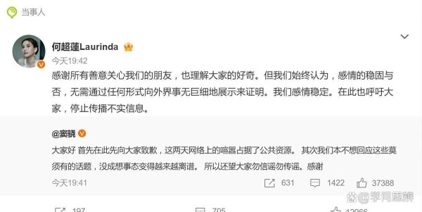 窦骁跟何超莲呢,当时还真沉住气,迟迟不发声。谁都知道这俩人一直低调到不行,结婚的时候也没大张旗鼓,大红大紫的婚纱照曝光那会儿甚至被网友评价“清流凉茶风”。可架不住眼下大家都在看热闹,真的是: 你不说点啥,谣言就更有了嚼劲。