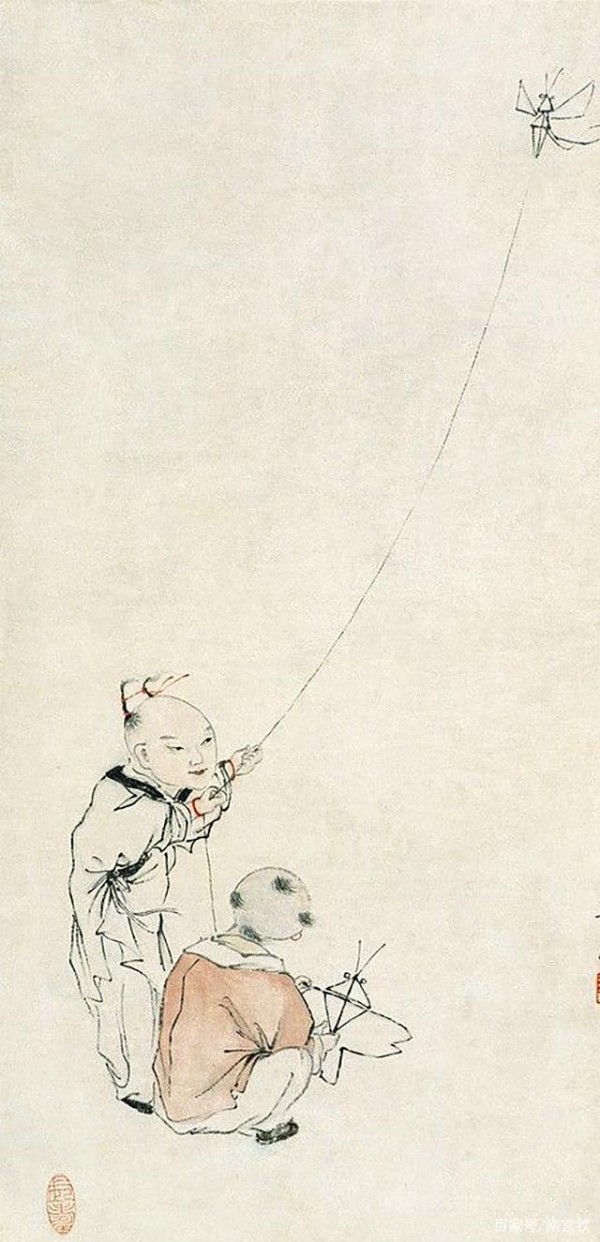 有一次,就有一个人登门拜访齐老先生,想要买一副4尺的画,在商定好价格后,齐白石老先生就开始作画了,他先是在纸上画了一个梳有两个小角辫的儿童,然后在纸张的右上方画了一个简单的蝴蝶风筝,最后再画一条线把风筝和小孩手相连接起来,这幅4尺的画就算完成了。