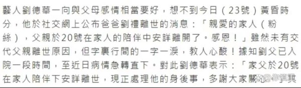 刘德华父亲刘礼病逝,港媒:华仔是圈中模范孝子!