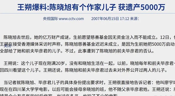 陈晓旭去世没多长时间,就有人冒用王朔的名义,声称陈晓旭和毕彦君有一个二十岁的儿子,说陈晓旭把全部财产都给了这个孩子,所以陈晓旭基金一直没法成立,这些说法非常具体,连孩子的名字、年纪、就读学校都描述得明明白白,甚至还附有照片。