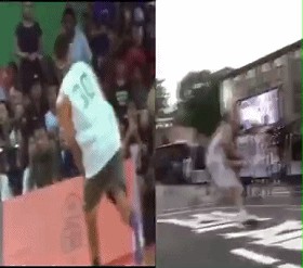 库里和汤普森被称为水花兄弟,场上场下都有着不错的关系,于是当汤普森的“勉扣”被传出来之后,库里也抓住了机会在中国行的时候“黑”了汤普森一把。在活动中,库里有模有样地学上了汤普森,运球、扣篮、被篮筐盖,甚至连摔在地上的动作都很像。不得不说,库里除了萌之外,还挺会玩的!