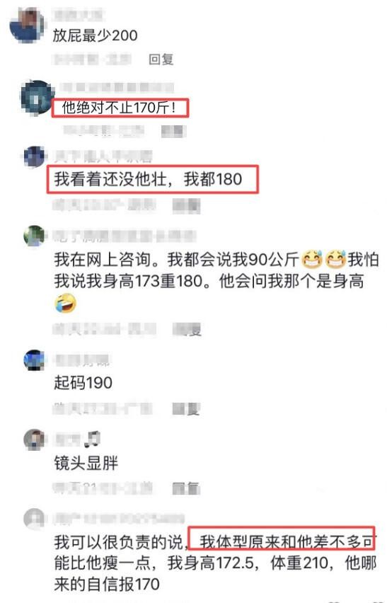 对于自曝身高体重的郝劭文,有网友就质疑称:“他绝对不止170斤”,还有网友拿自己对比称:“我看着还没他壮,我都180”,也有网友留言称:“最少200斤”。