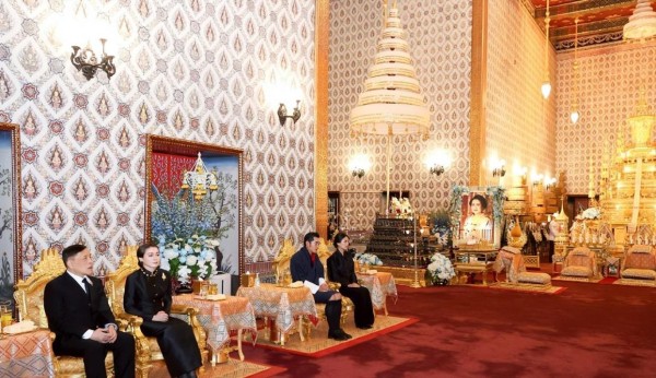 10月29日那天,地点是在大皇宫的王座厅,国王和王后严格按照泰国王室的最高礼仪行事,先是在诗丽吉王太后的灵柩前跪拜、献花,然后还签了悼词。接着,两国的僧侣一块儿主持了诵经的仪式,场面庄严又庄重。