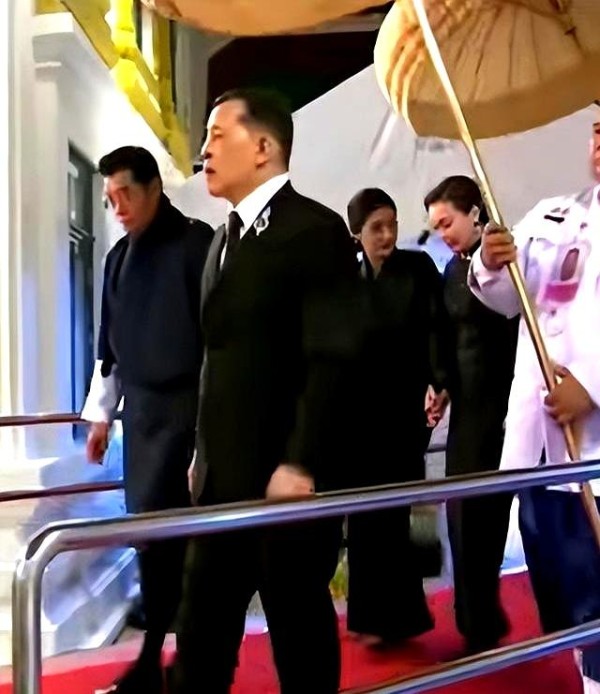 泰国王后苏提达也如往常一样身着黑衣,饰品简化到极致,只为表达哀悼。