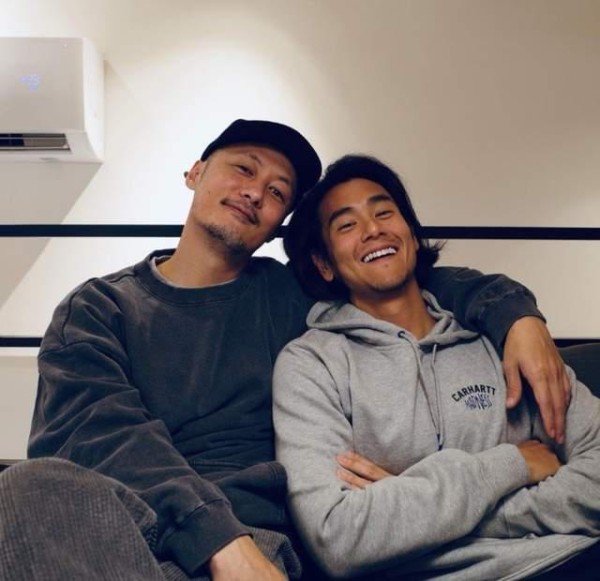 余文乐身穿黑色上衣,戴着棒球帽,把手搭在彭于晏身上,彭于晏则很自然的依偎在余文乐肩膀处,两人很亲密同框。彭于晏身穿灰色连帽卫衣,运动气息十足,两人都留起了胡子显得胡子拉碴的,也都沧桑了不少。