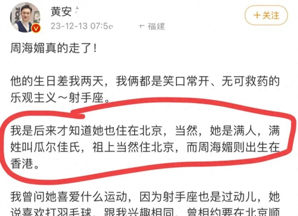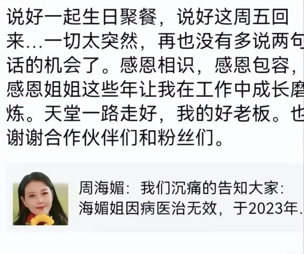 黄安凌晨发文!曝周海媚家世显赫,本有大生还机会,充满愧疚遗憾