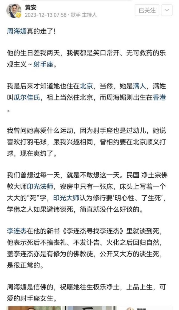 好多明星在知道这个消息后都发文哀悼,特别是黄安的文章,感情真挚。