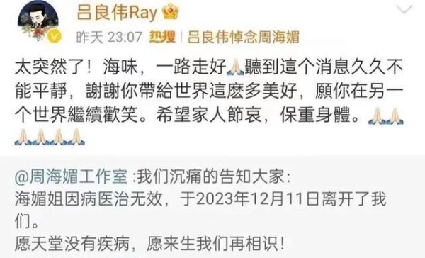 周海媚的前任老公吕良伟在她去世时发文悼念,但因为称呼她为“海味”,引发争议上了热搜。