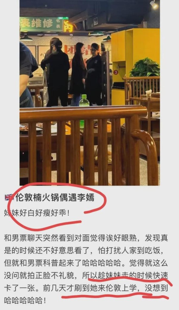 近日,有网友偶遇在国外留学的李嫣与一众好友一起去吃当地的“重庆火锅”,看来是想念家乡味道了。