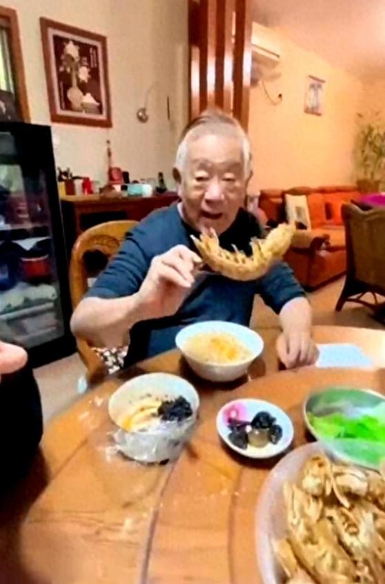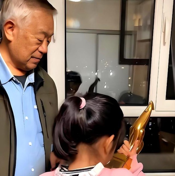 83岁的老戏骨高明穿着件洗得发旧的深色毛衣,正往孙女碗里夹虾仁,小姑娘戴着圆框眼镜,腮帮子鼓得像只小仓鼠。