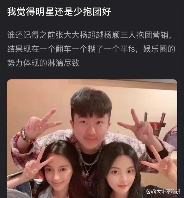 张大大事件爆发后,之前和他玩儿的好的杨颖、杨超越也被拉出来了张大大事件爆发后,之前和他玩儿得好的杨颖、杨超越也被拉出来了