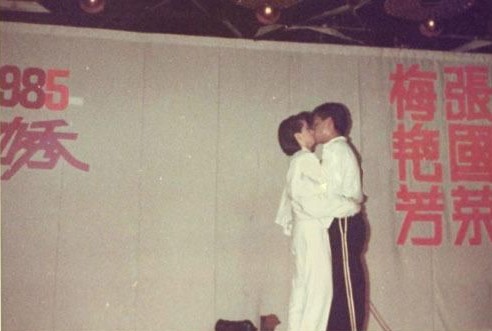 有一次,在梅艳芳的演唱会上,张国荣身穿一身帅气的西装,手捧着鲜花登上舞台,而且还直接跟梅艳芳当众吻了起来。