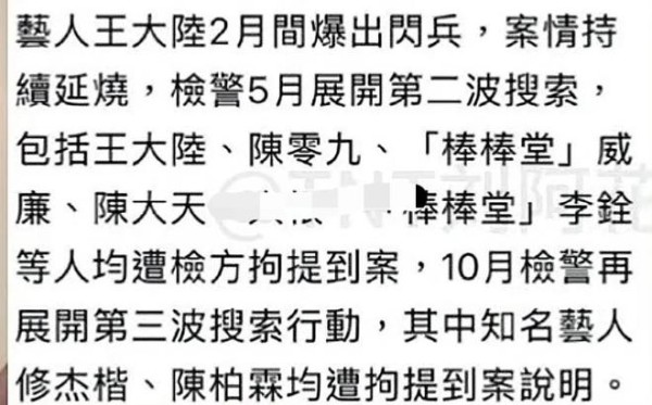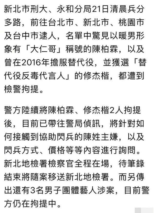 王大陆事件后,台湾娱乐圈再次掀起高潮,暖男陈柏霖,贾静雯的老公修杰楷被爆带走拘提,疑似和服兵役有关。目前,不排除有更多的艺人会牵扯其中。