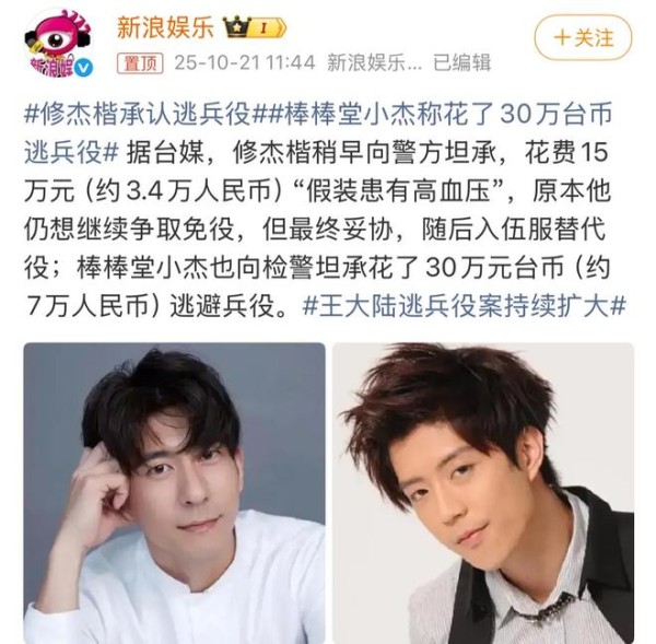 台媒体最新报道,修杰楷承认逃兵役,花费了15万元台币,假装患有高血压,原本想继续争取免役,最终妥协入伍服替代役。