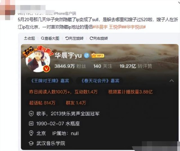 其实,早在路人朋友爆料之前,就有网友扒出他们两人都在浙江,疑似偷偷约会,为了掩人耳目,女方迟迟没有更新动态,让ip地址一直显示北京,如此小心翼翼地约会,也真是为难华晨宇了。