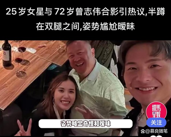 最近一张合影在网上吵翻了天——25岁的年轻女星和72岁的曾志伟同框,照片里女星半蹲在曾志伟双腿之间,这个姿势被不少网友吐槽“尴尬又暧昧”。