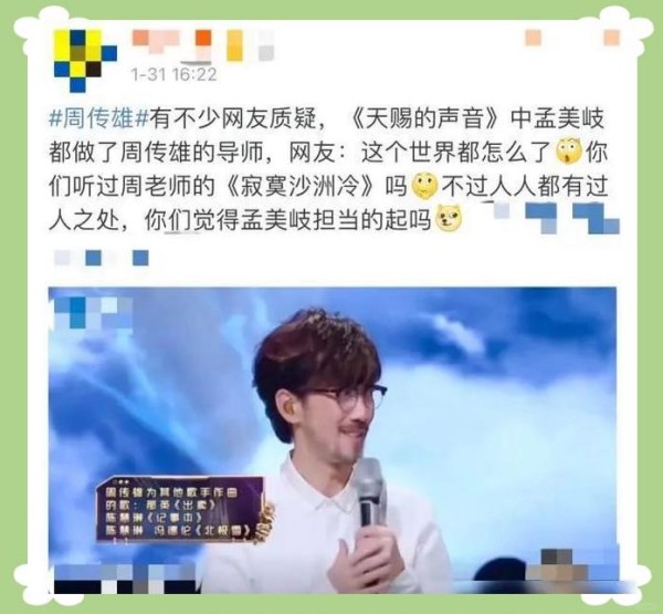 周传雄发文回应“被孟美岐点评”:没有谁应该是谁的导师