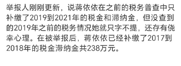 这场劲爆的瓜源于一位网友在社交平台上的爆料,直指蒋依依涉嫌偷税漏税(tsls)问题。更加惊人的是,这些指控得到了官方认证,使得整个事件显得丝丝入扣,毫不虚构。据爆料者称,蒋依依在2019年到2021年期间的税务问题曾引起税务局的关注,而她与其工作室曾被约谈。面对税务问题,蒋依依选择了补交税款,但却有意无意地对2019年之前的问题保持沉默,抱有一种侥幸心理。