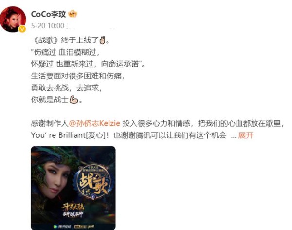 李玟社交账号最后一条动态,还在宣传自己的新歌《战歌》,歌词里写道:“伤痛过 血泪模糊过,怀疑过也重新来过,向命运承诺”。