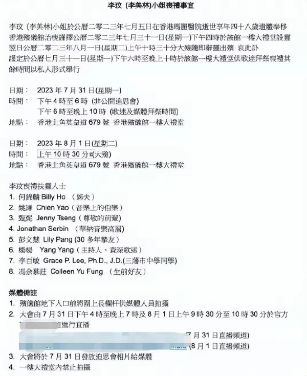 此次的葬礼活动是由李玟的两个姐姐和姐夫共同筹办的,因此扶灵名单人为首的就是她的姐夫何锦麟,其余八人分别是李玟生前的前辈伯乐姚谦,挚友彭文慧、前辈甄妮、资深深歌迷杨杨,还有华纳的高层,已经李玟生前的两个非常要好的朋友。