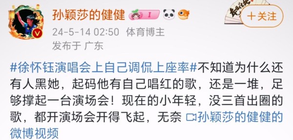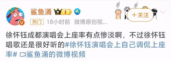 5月14日,实力歌手徐怀钰引起了网友的热议。起因是在成都演唱会上,徐怀钰调侃了上座率,称其实有点孤单寂寞冷,你们就坐紧一点,没关系。中间的空着没有关系,我不太在乎这一点。她清唱一首《不要再孤单》,回馈了粉丝,这首歌温暖了整个现场。