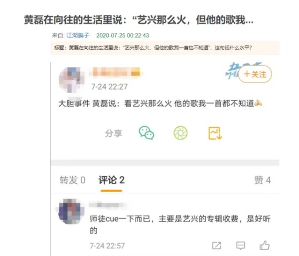 7月24日,黄磊常驻综艺最新一期播出。节目中,黄磊和老狼聊到音乐时,毫不遮掩地表示“你看艺兴那么火,但他的歌我一首也不知道”。如果这句话从别的前辈嘴里出来,网友们基本不以为意,但在师父黄磊的口中说出,网友的好奇心就会被瞬间点燃。